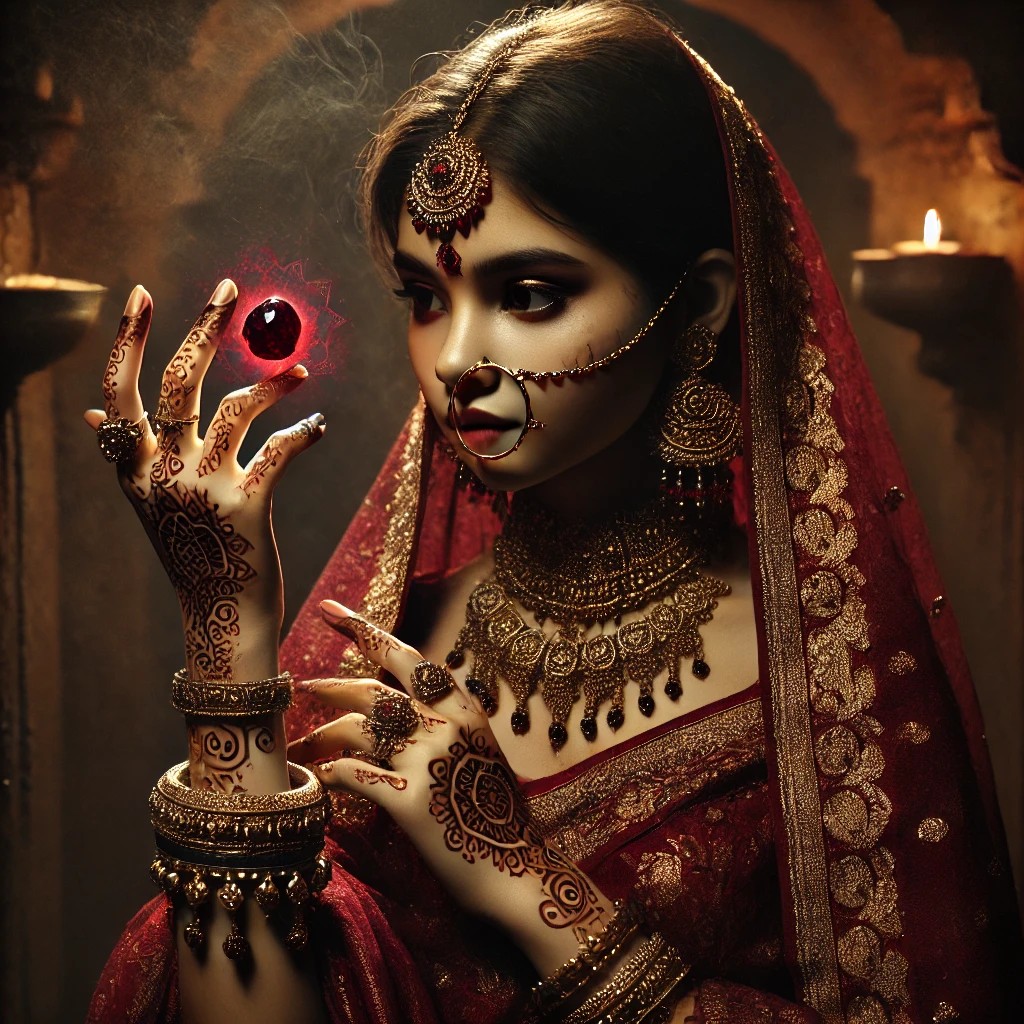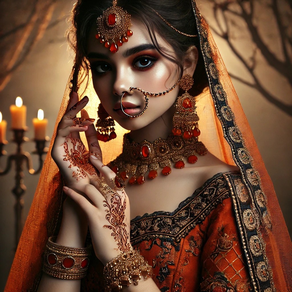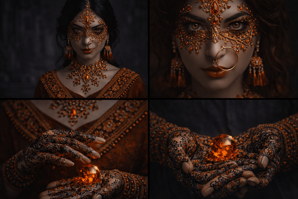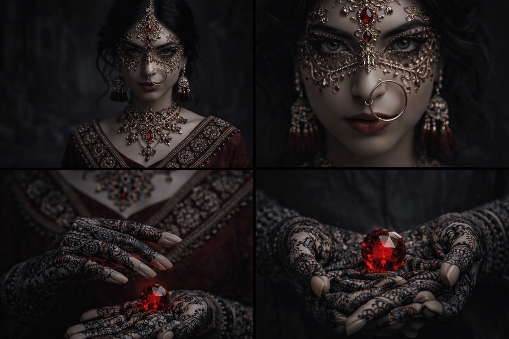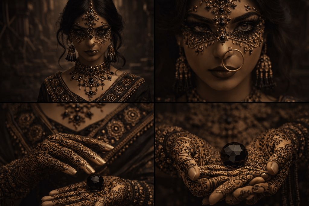 It holds the richness of traditional form — sarees, jewelry, mehndi, silhouette — but shifts them into a darker, more cinematic space.