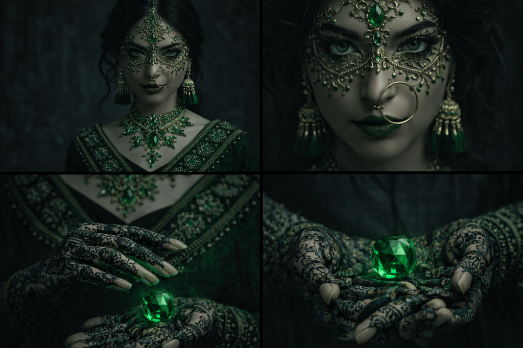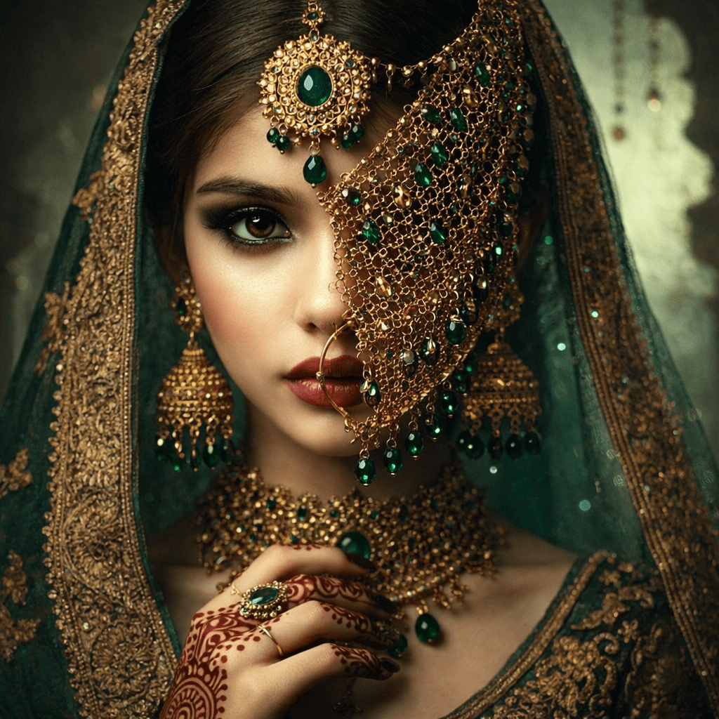 Ornament lives in shadow. Gold is never bright, never polished for shine. It is aged, antique, and weighted, carrying history rather than display. Stones follow the same progression as the mehndi sequence — emerald greens, deep ambers, and dark reds — each tone grounded and deliberate.