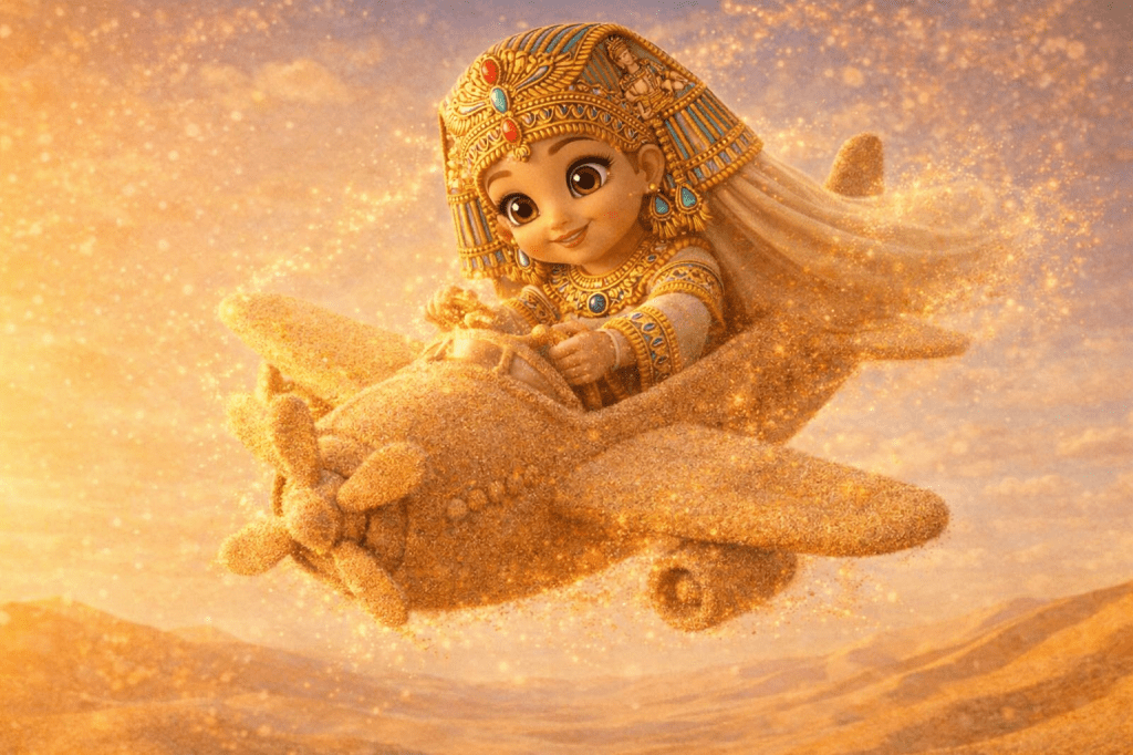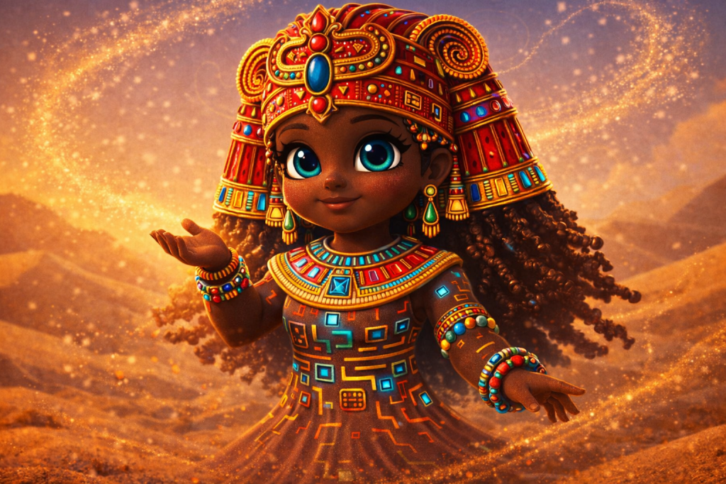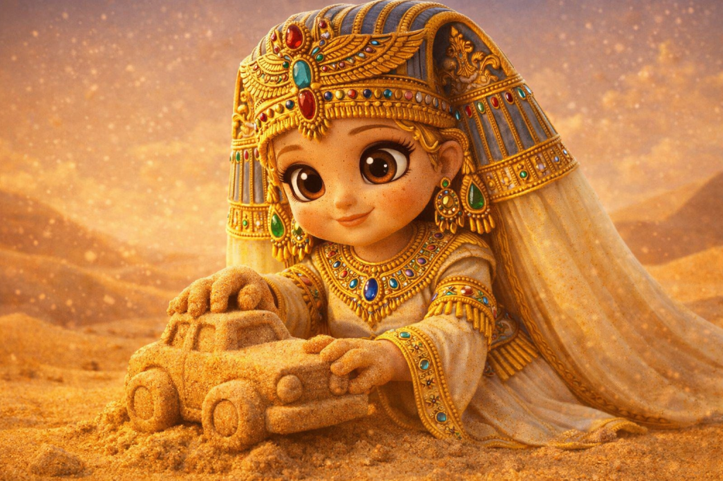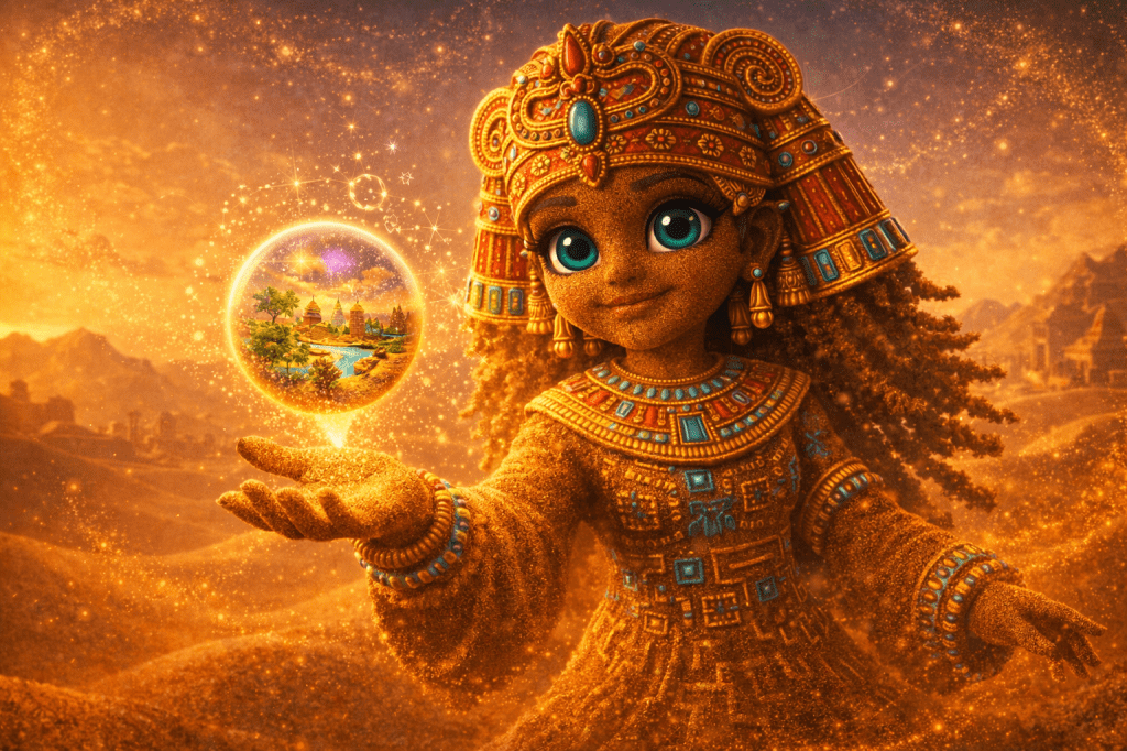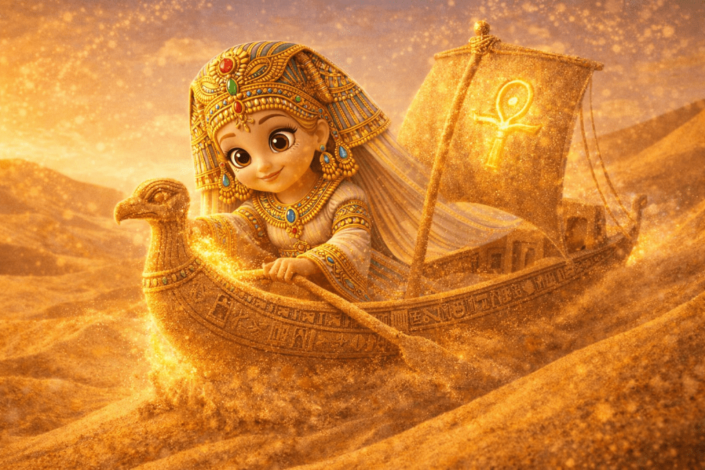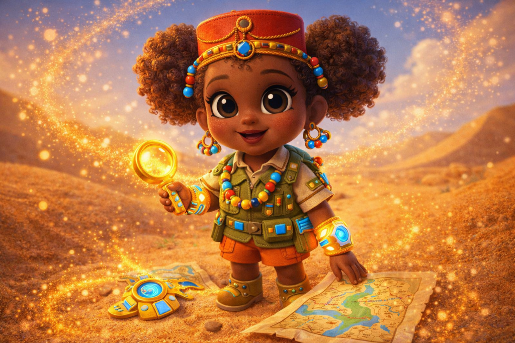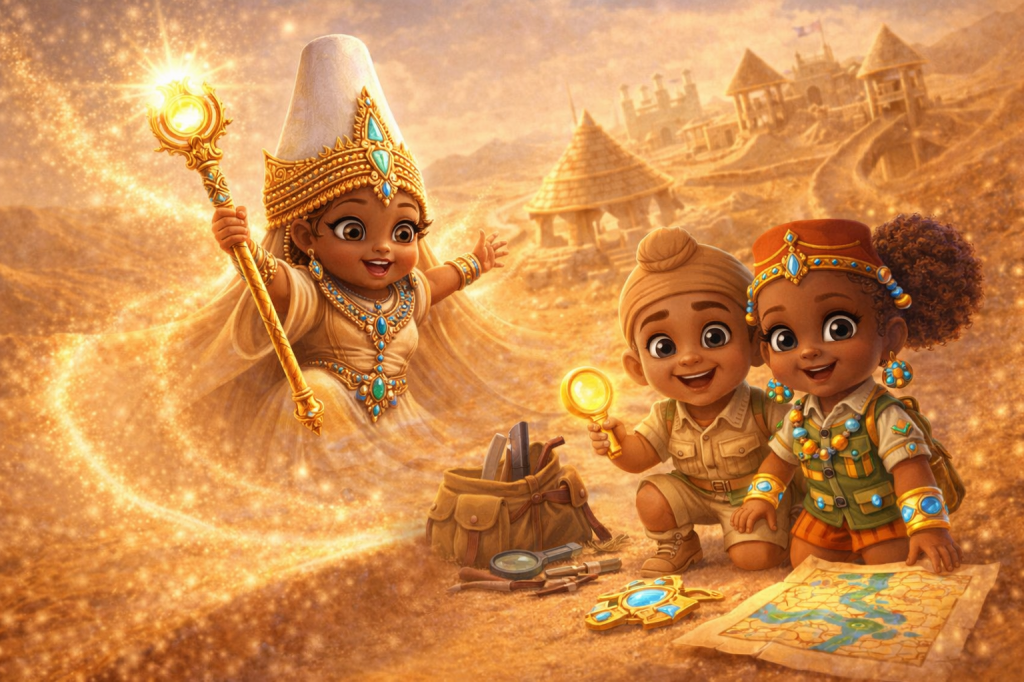This is a universe where young explorers from across the world come together. They learn, play, and create. Children are guided by the curious, kind, ever-changing Safari Pharaohs. These guides help them journey across glowing dunes, sparkling oases, sand cities, and ancient kingdoms sculpted entirely from sand.
