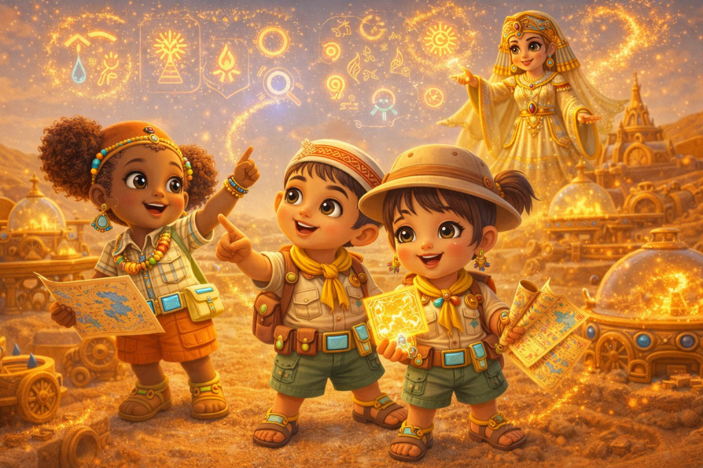 Through every game, trade, and puzzle, children are encouraged to explore big ideas. These include problem-solving and critical thinking. They also learn real-world concepts like trade, culture, and history. This happens all while having fun in a magical, sand-shaped world.