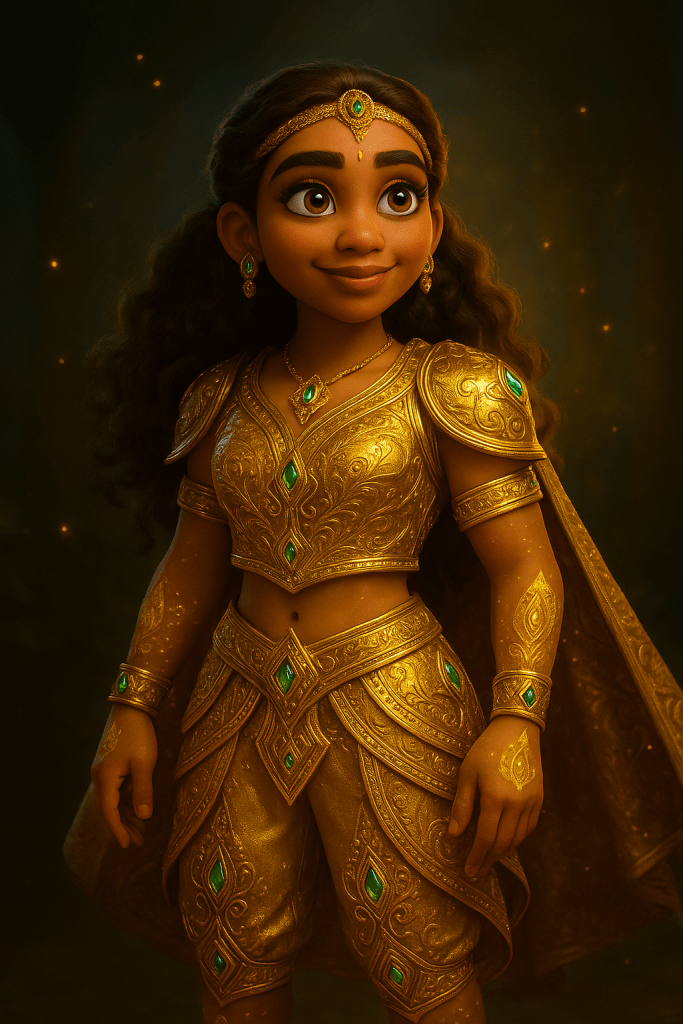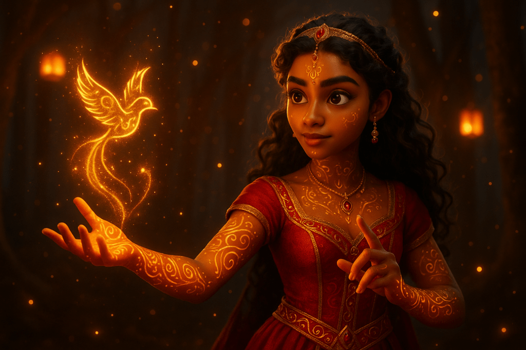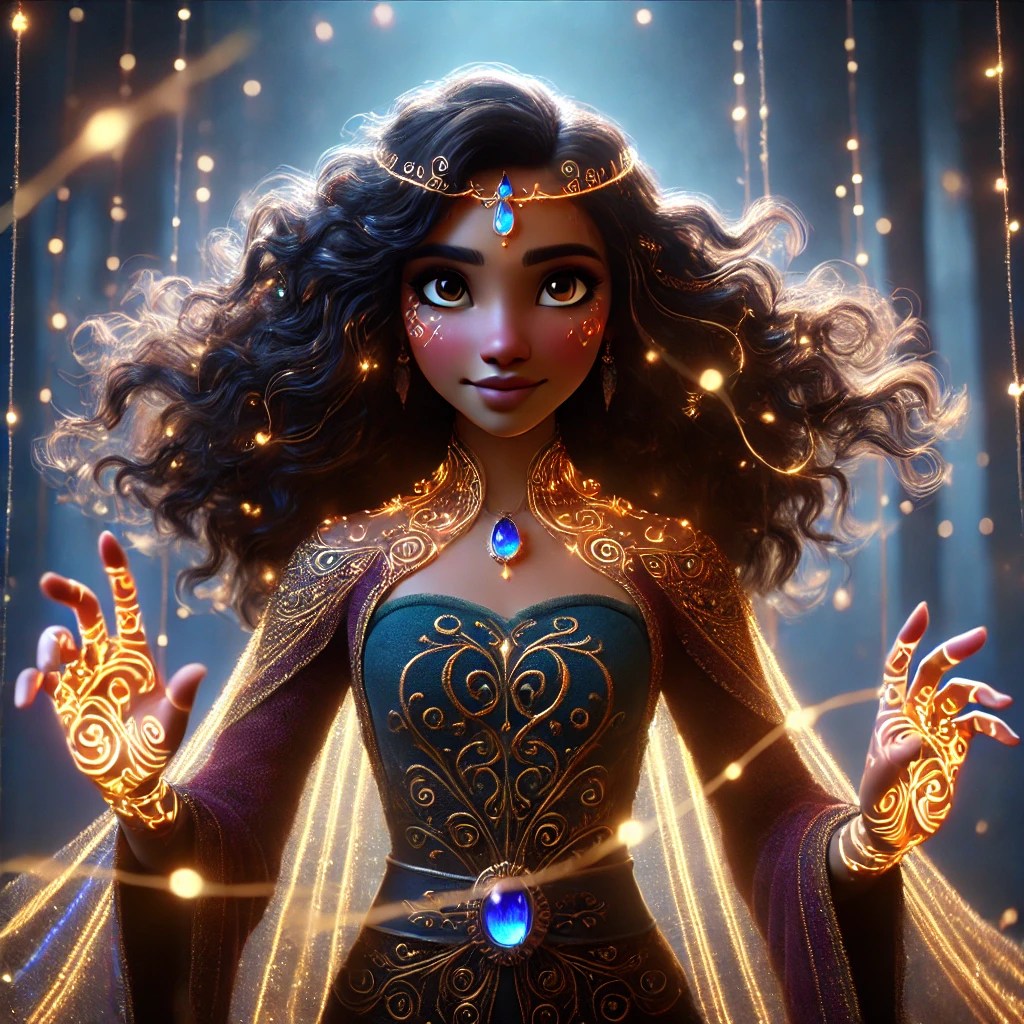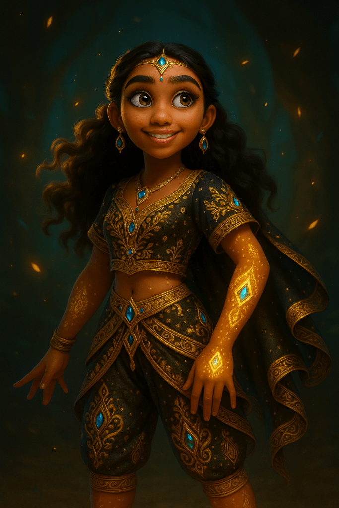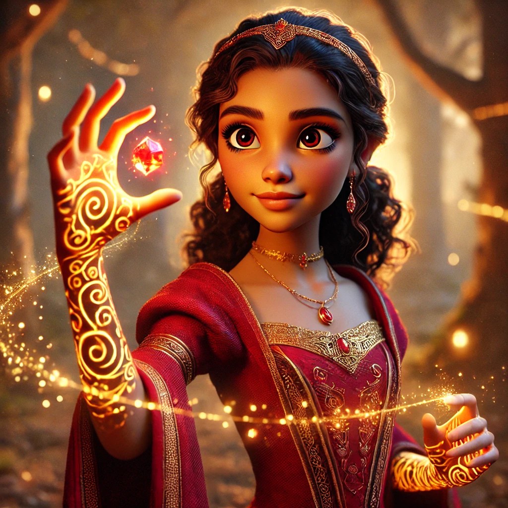 Mehndi is a bold and brilliant 15-year-old young lady of South Asian heritage, fierce, intuitive, and loyal, whose power flows through the intricate henna patterns on her skin. Rooted in tradition, her magic awakens through emotion — especially passion and protection — sustained by a warm red ruby pebble that chose her and pulses with the fire she carries within. When her hands ignite with golden flame, ancient symbols rise to life, conjuring protective forces and mythical forms, most notably a radiant phoenix born of fire and ink. A natural leader, Mehndi is brave and quick to act, yet deeply compassionate and protective of those she loves. Her bond with ritual, family stories, and sacred art runs deep, and her journey is one of balance — learning to guide her powerful magic with intention, grace, and purpose.