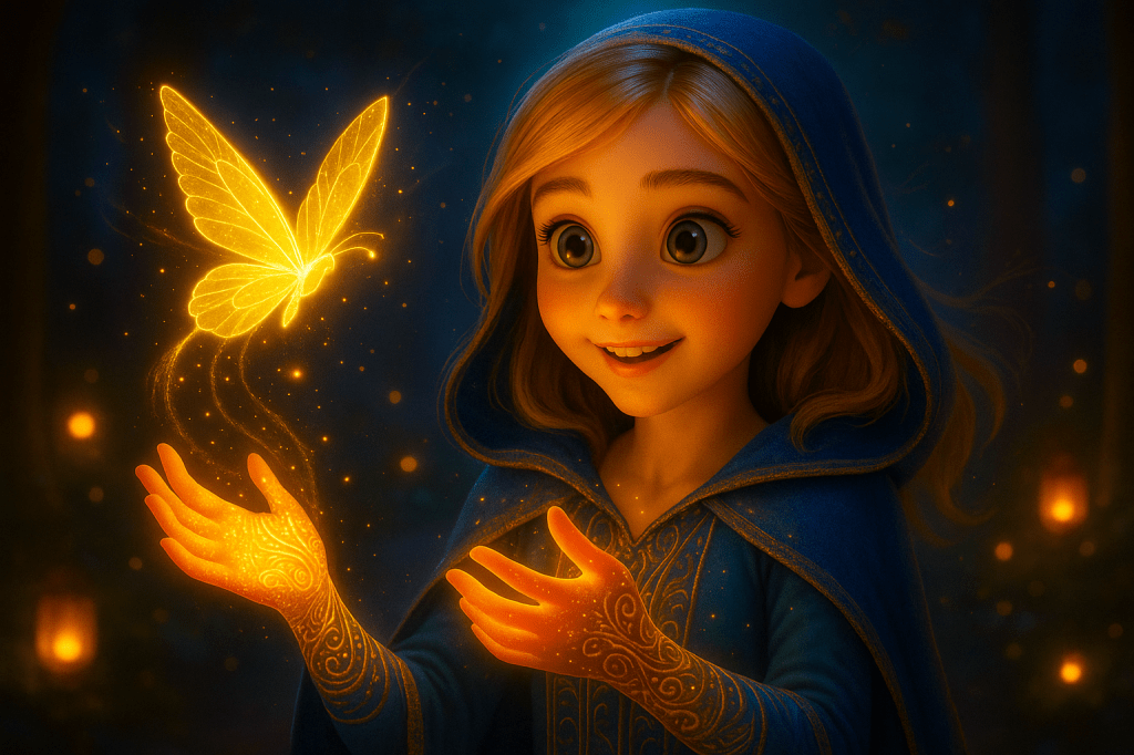 Willow is a gentle yet vibrant 15-year-old young lady of British heritage, curious, thoughtful, and optimistic, whose magic flows like the wind — breezy, playful, and powerful when needed. Glowing blue henna patterns trail across her arms, and a soft-hued pebble that chose her hums with airy energy, sustaining her connection to movement and light. With a gesture, she can summon gusts, lift objects, and call forth a luminous butterfly of light, her spirit symbol and guide. A quiet observer, Willow notices what others miss — a shift in mood, a subtle feeling, the faintest ripple in the air. Though soft-spoken, she carries a quiet courage, uplifting others with imagination and calm strength. Her journey is about trusting her inner voice and discovering that her gentleness is not weakness, but power — bringing balance, joy, and lightness to the team like a breeze that carries everyone forward.