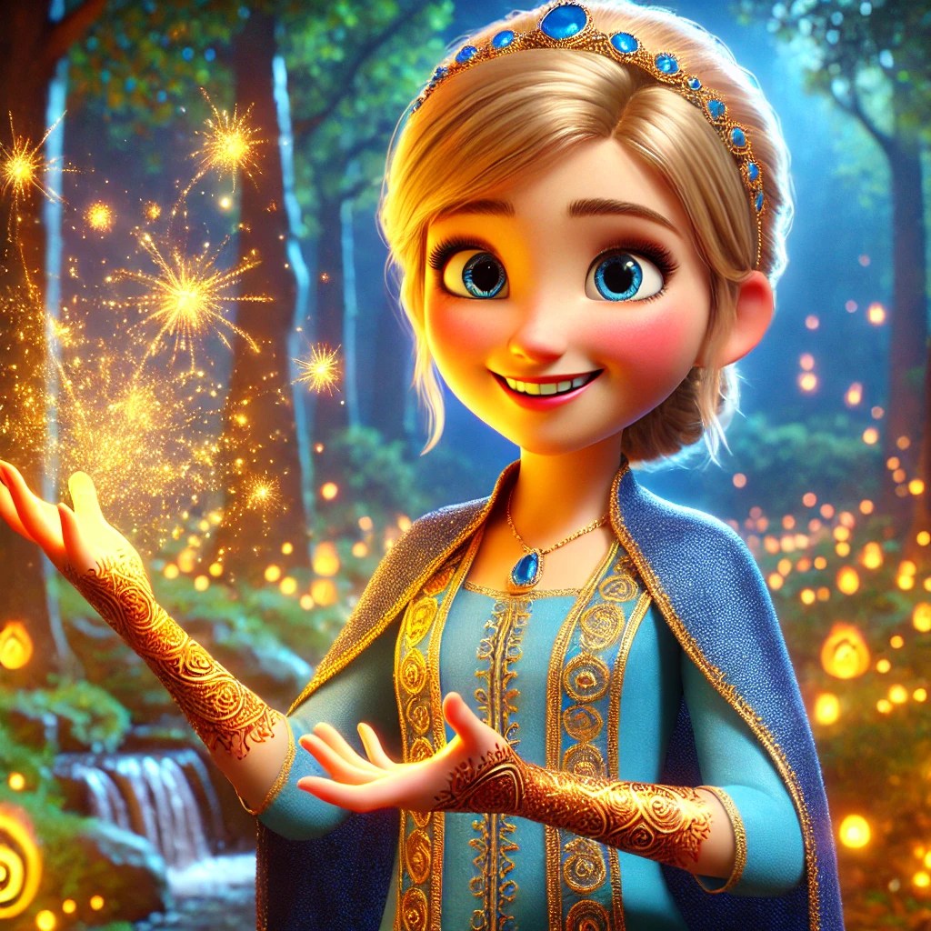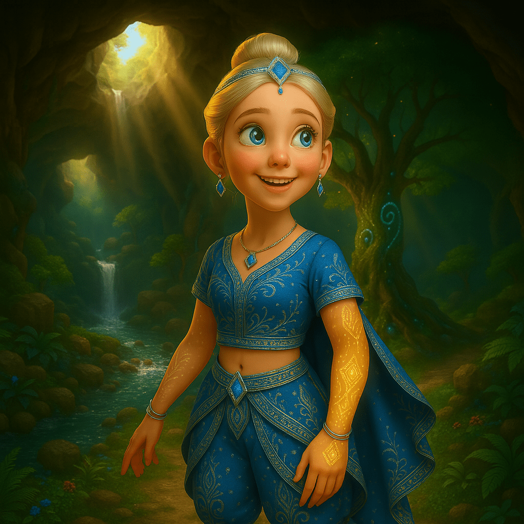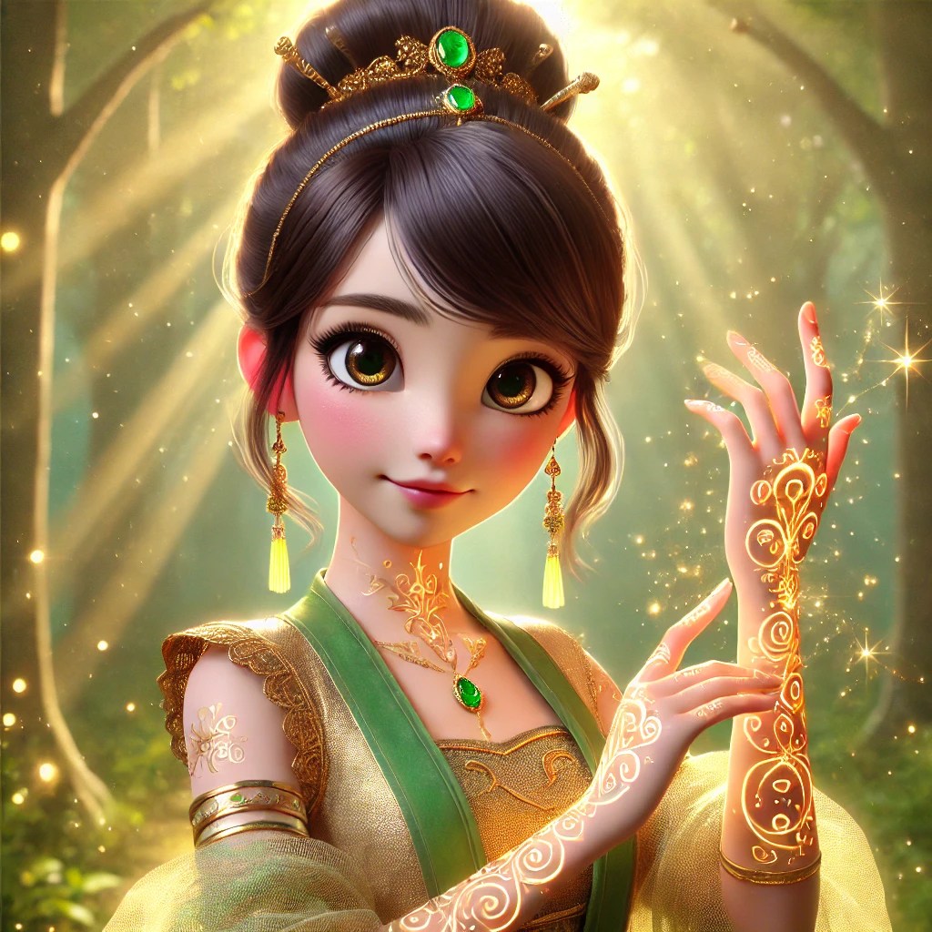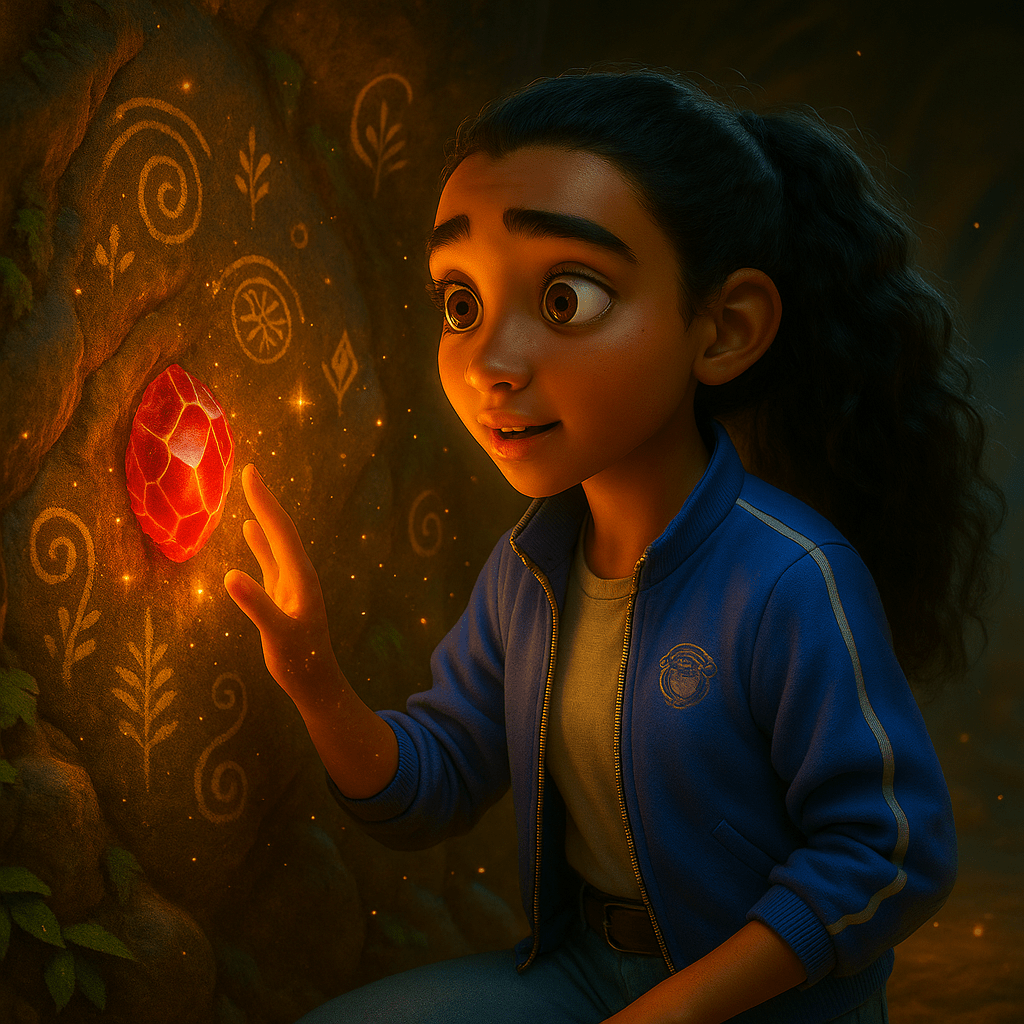 Henna is a graceful 15-year-old young lady whose presence brings calm, clarity, and quiet strength to the group. Thoughtful and perceptive, she moves with purpose, her magic rooted in light and inner balance. Soft, luminous henna patterns glow along her skin, sustained by the radiant pebble that chose her, a steady source of energy that responds to her focus and emotion. Through gentle gestures and fluid movement, she can bend light into shields, illusions, or guiding beams, her spirit symbol appearing as a radiant form that reflects wisdom and harmony. Henna is observant and deeply empathetic, often sensing emotional shifts before words are spoken. While she may seem reserved, her strength lies in stillness and insight, grounding the others when emotions run high. Her journey is one of confidence — learning to trust her quiet voice and understanding that light does not need to be loud to be powerful.
