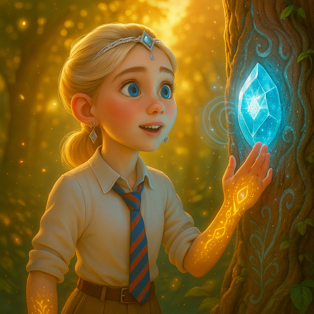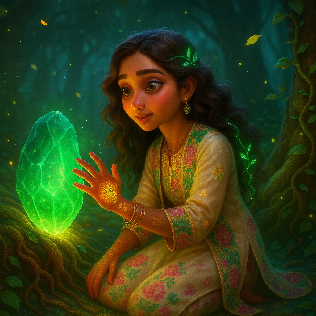 They touch the glowing sap. The air shifts. Ruby-like stone pebbles rise around them, each shining a different hue — red, blue, gold, green — each choosing a young lady as if drawn by her heartbeat.