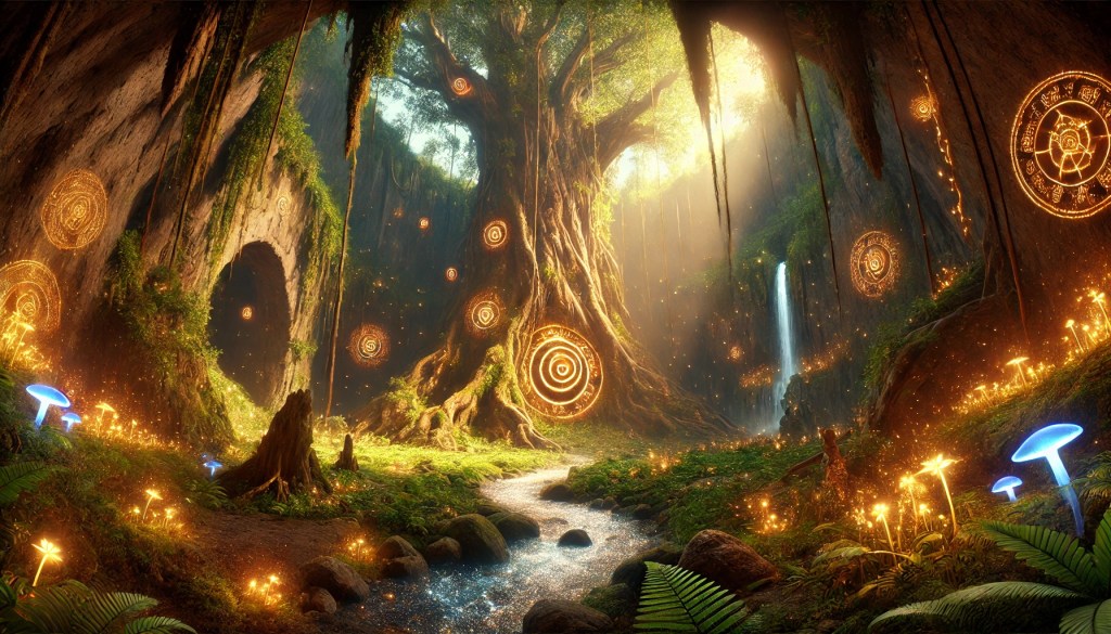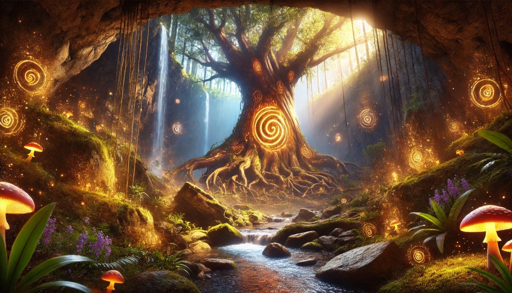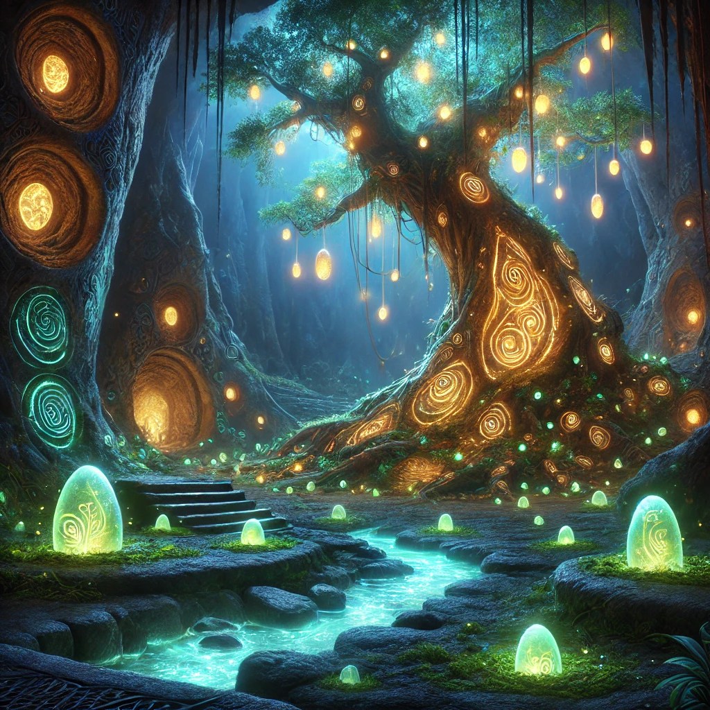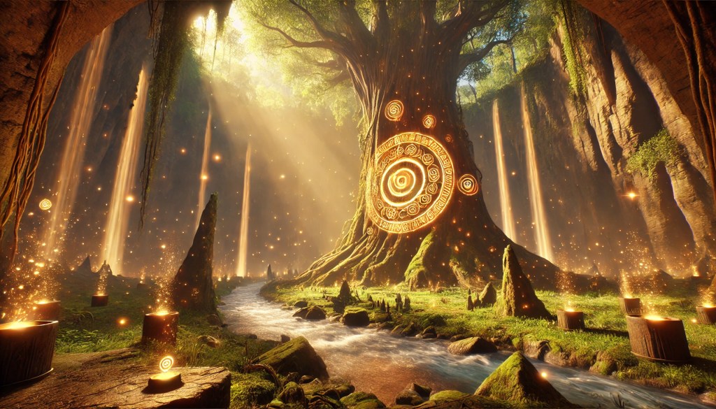 Through these roots, the tree draws in the stones’ energy, transforming it into a luminous essence that gathers as glowing sap along its bark and leaves.