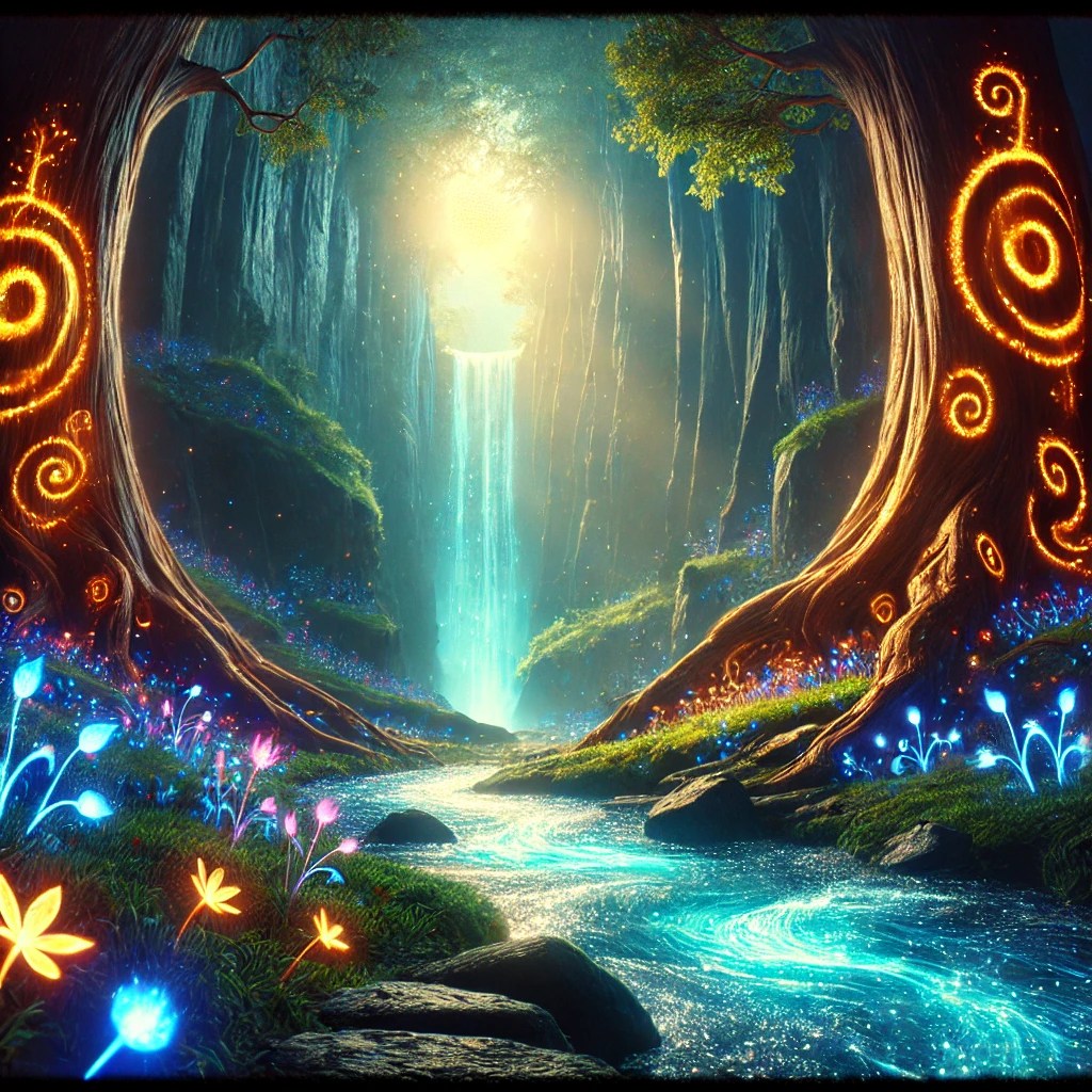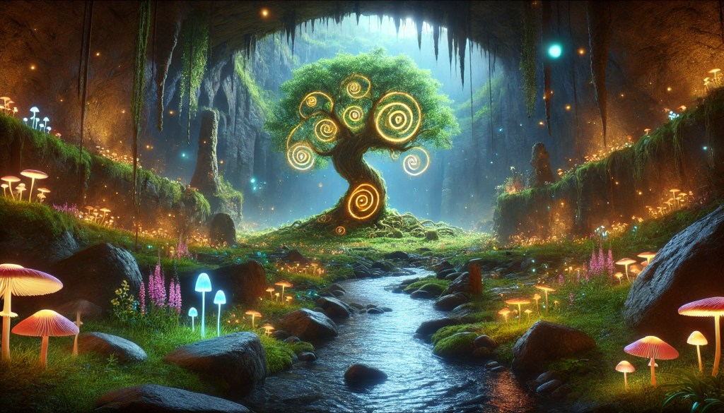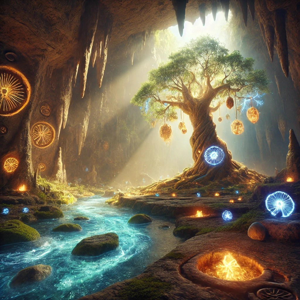In the hidden garden, the ancient stones beneath the earth feed their energy into the tree, and its luminous sap gathers that power in every leaf.
