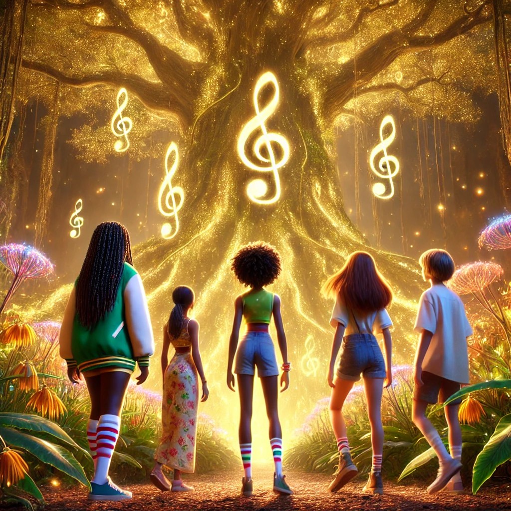 Around the tree’s roots, ruby-like pebbles, each pulsing with a unique hue and vibration, rise to choose the young ladies.