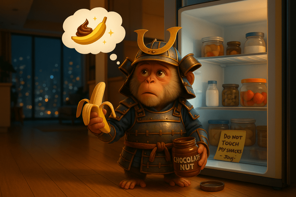 With a fistful of grapes and a basket of macaroons, our samurai displays a face of pure innocence. He executes the ancient art of “helping himself.”