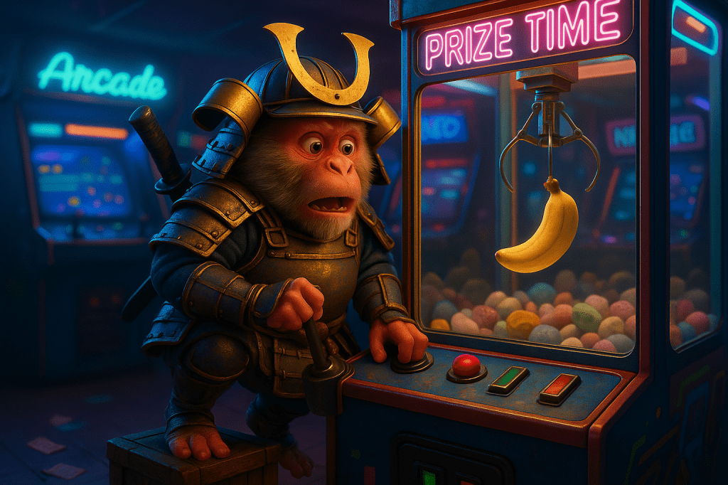 Suji spots the prize: a plush banana, grinning like destiny.