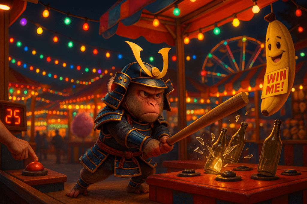 In front of him: a banana toss booth and existential confusion.